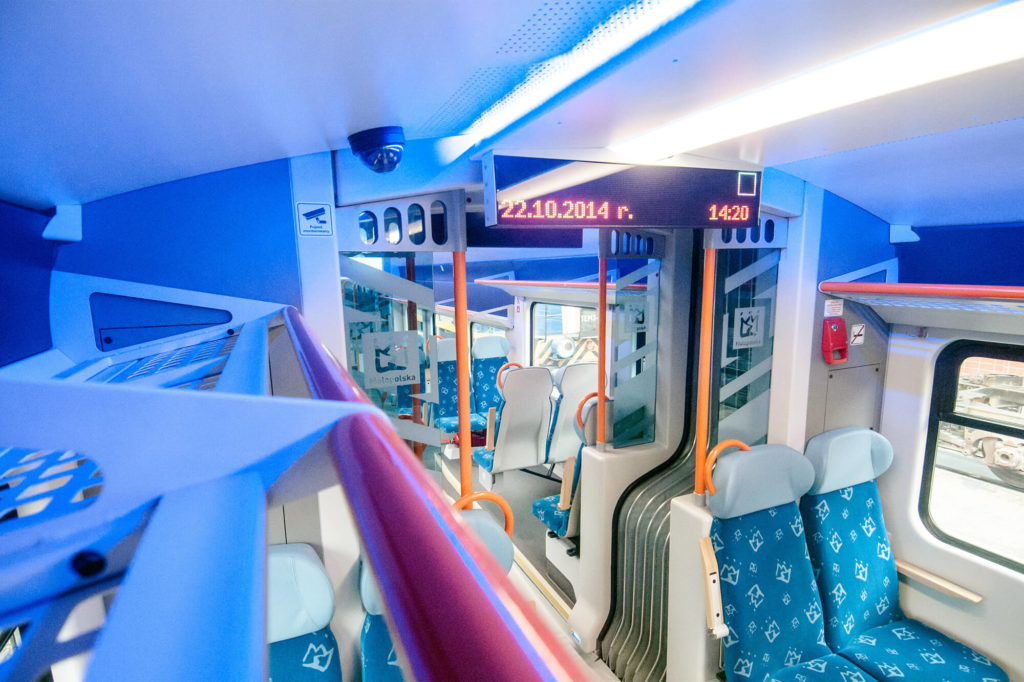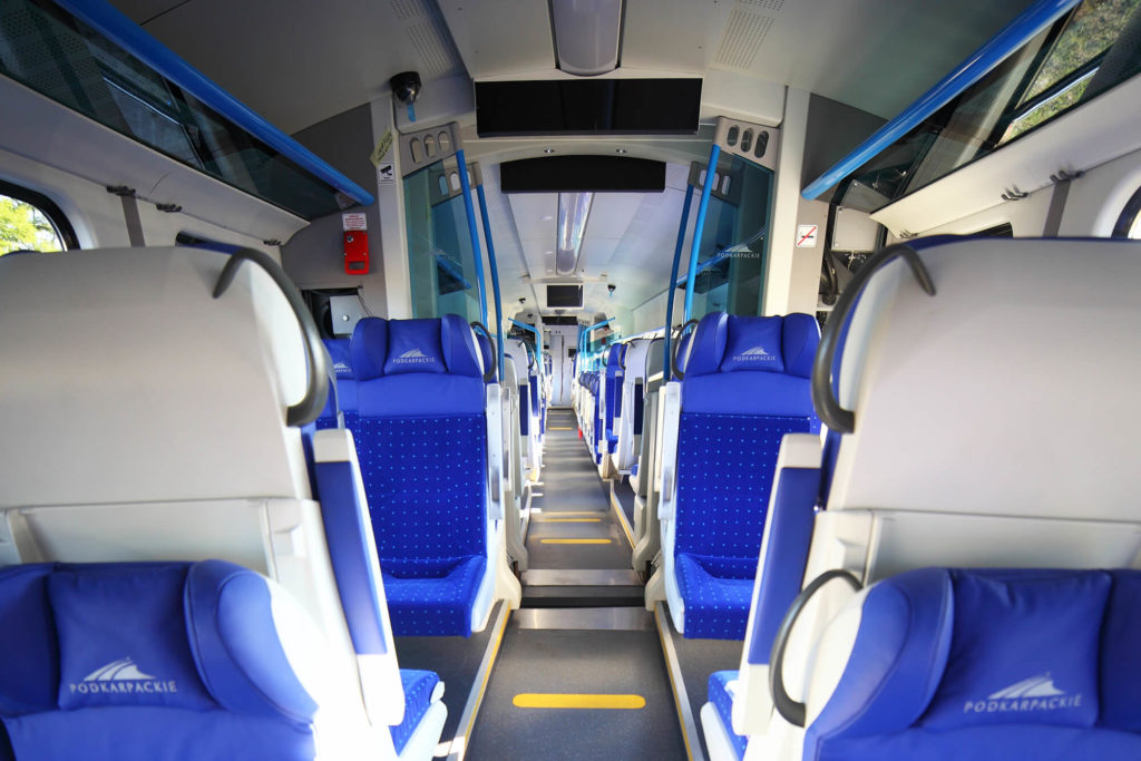 The functional layout of the interior allows comfortable travelling in air-conditioned rooms with a modern design.The vehicles include a series of conveniences for people with reduced mobility, i.e. entry platforms or lift – facili- tating boarding, and a spacious toilet cabin fulfilling the highest standards, i.e. the TSI PRM. Passengers have access to WiFi while on board. The information system simplifies delivery of announcements to passengers.